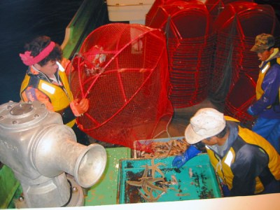 かご揚げ5:船頭がかご揚げを、乗組員は選別と餌付けを担当します。3人の呼吸の合った作業が黙々と続きます。