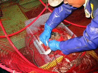 かご揚げ4:エビを取り出した後、かごに新しい餌(ホッケ)を付け、かご入れの準備を行います。