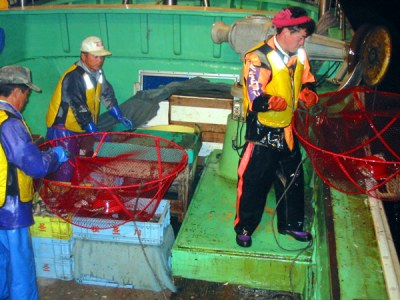出荷前選別:帰港午前9時。「今日はまずまずの漁だったなぁ・・・」帰港後の選別にも力が入ります。