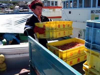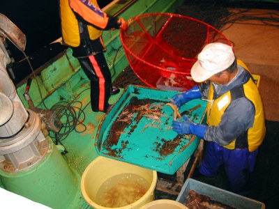 噴火湾海域での操業は春と秋で、1隻あたり500個のかごを使って行われます。餌を入れたかごを海中に投入し、翌日かごを引き揚げエビを漁獲しますが、漁獲されるエビの大半はトヤマエビです。漁獲したエビは船上で大まかに選別、鮮度保持され、帰港後、雄、雌、さらに大、小に選別して出荷されます。