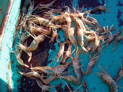 漁獲直後のエビ:漁獲直後のエビは透明で、まだ赤い色が無い状態です。