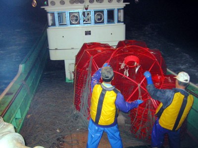 かご揚げ2:引きあげたかごを船のヘリに取り込みます。「大漁だぁ・・・!」