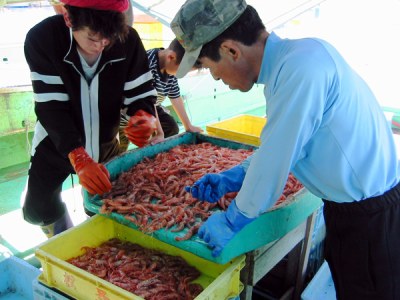 船上選別:漁獲したエビを雌雄に選別し、水氷に入れて鮮度を保持します。