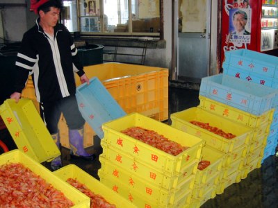 出荷2:「今日の値段はどうかな?」セリ値を気にしながら、規格別に漁協市場へ出荷。