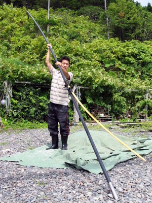 | 漁具 | ・かぎ(鈎):浅みに着生しているコンブを採るための棒状の漁具で漁期の前半で使用されます。 海面になびいているコンブをかぎですくい上げ、船に引き寄せて手で引き抜いて採ります。 柄の長さは、漁場によって6~9メートルと使い分けており、先端のかぎ部分は60センチメートル前後です。 また、柄の材質には、木製とFRP製がありますが最近は軽くて丈夫なFRP製が普及してきており、かぎ部分は木製とステンレス製があります。 この他にも魔法のかぎと呼ばれる漁具が地域によっては使用されています。*FRP:繊維強化プラスチックのこと。 ・ねじり(かたしば):深みに着生しているコンブを採るための棒状の漁具で漁期の後半に使用されます。 棹先が二股に割れており、海底に下ろして回転させコンブを絡めて抜き採ります。 柄の長さは約5~10メートル、先端部分(かたしば)の長さは2メートル前後あり、材質には木製とFRP製があります。 なお柄の部分は、ワンタッチで取り外しできる構造になっており漁場によって長さ調整が可能です。 ・まっけ:時化(しけ)等の影響で抜け、海岸に寄せられたコンブを採るかぎ状の漁具で、波打ち際から沖にむかって投げ入れ、コンブを爪で引っ掛けて採ります。 爪の部分は、鉄製です。  |