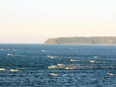 出漁:海上に設定されたスタートラインから合図を受け、こんぶ漁場へ一斉に出漁するところです。