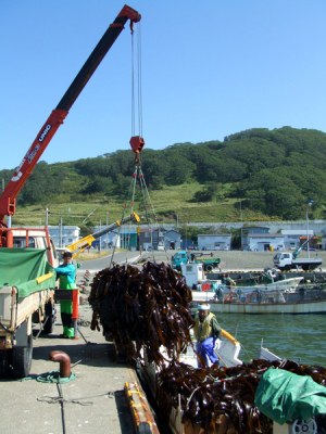 荷揚げ:採取したコンブを船からトラックにクレーンを使って荷揚げするところです。