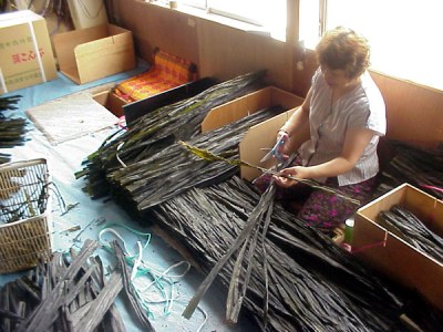 切断:天日干しされたコンブを束ねて、切断するところです。
