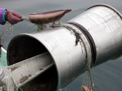 揚網1:ネットホーラー(揚網機)で網を揚げていきます。