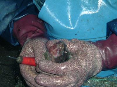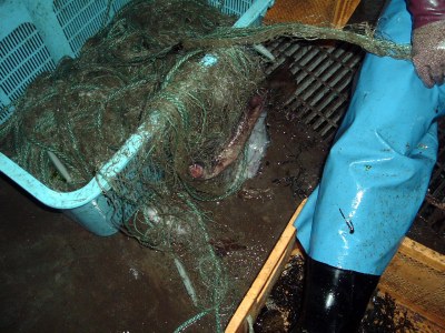 網外し2:網を破らないようにカギを使って網目からナガヅカを外していきます。