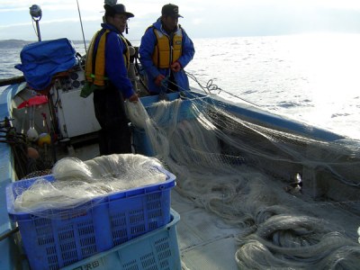 網はずし1:出面さんたちが羅網したニシンを上手に外していきます。