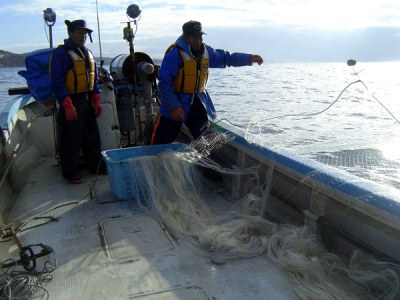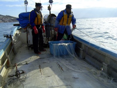 陸揚げ1:羅網したニシンを刺し網から外すため、陸にあげます。