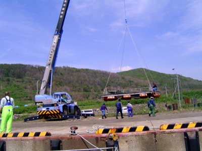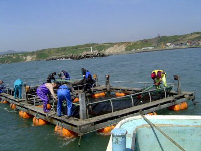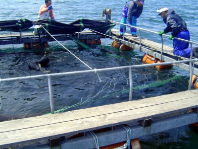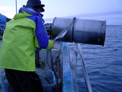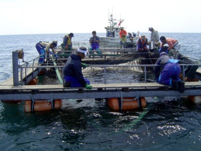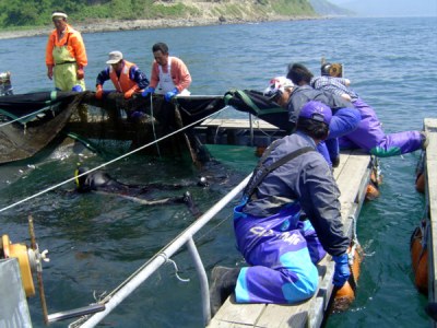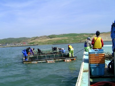 中間育成2:放流には生け簀ごと船で沖まで運んでいき、その場で生け簀網を解放して稚魚を放流します。
