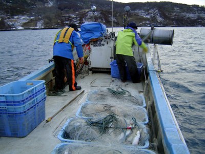 揚網3:回収した刺し網を籠に入れ、ほかの網と絡まないようにして持ち帰ります。