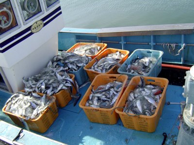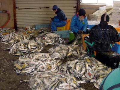 箱詰め:雌は下氷された箱に腹を上にして1箱5キログラム詰めで1尾ずつきれいに並べられて出荷されます。雄は下氷は一緒ですが5キログラム入れで詰め込まれて出荷されます。この時1箱40尾以上入っているものは荷受けできません。