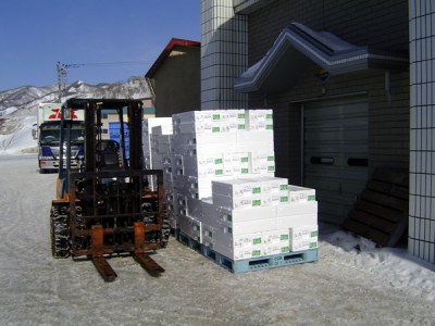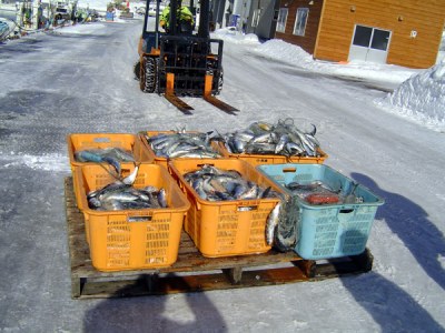出荷:箱詰めされたニシンはきれいに段積みされて消費地市場への発送を待っています。