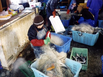 陸揚げ2:羅網したニシンを刺し網から外すため 、出面(でめん:陸仕事担当のおばさんたち)さんの待っている作業場(番屋)へ移動します。