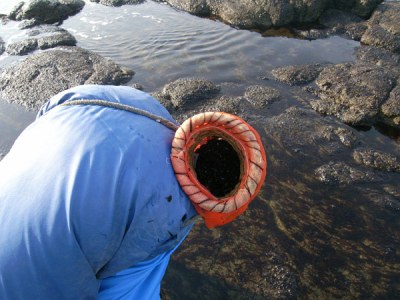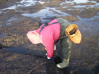 採取5:摘み取ったノリは腰に下げた籠に入れます。