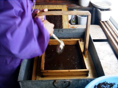 のり打ち1:簾(すだれ)に四角の型枠を載せ、その中に、穴が出来ないよう丁寧にノリを流していきます。この作業を「のり打ち」と言います。