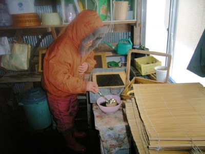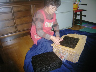製品化:ノリを一枚一枚簾からはがし、袋詰めします。