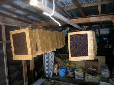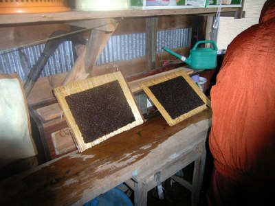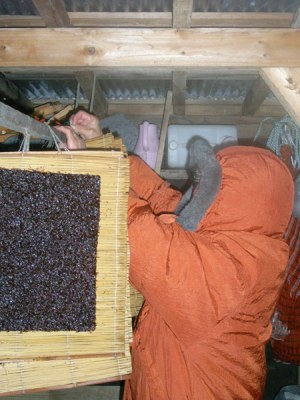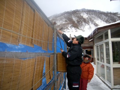 乾燥凍結1:のり打ちの終わった簾を、一旦小屋の中で水を切り乾燥させます。