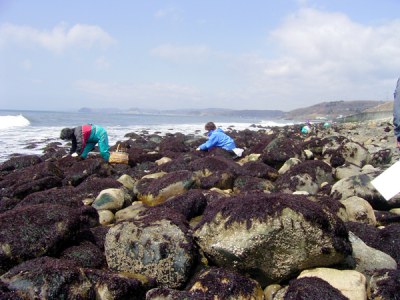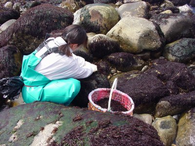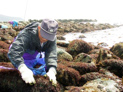 ふのり漁業は1~6月までの干潮時に行われ、コンブ採取が始まる前の春の重要な漁業となっています。漁場は潮間帯磯場の最上部に形成されるため、老若男女を問わず行うことができます。漁法は手採りのため、漁具は採取したフノリを入れる背負い籠だけあればよいという比較的簡易なもので、経費の掛からない漁業です。