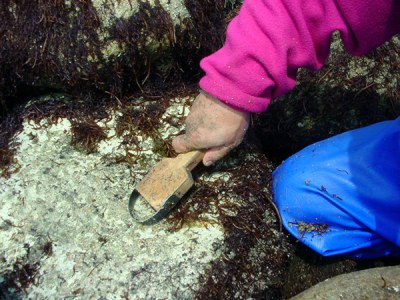 磯掃除3:既存のフノリが生えている部分(座)を傷を付けないよう注意深く作業を行います。