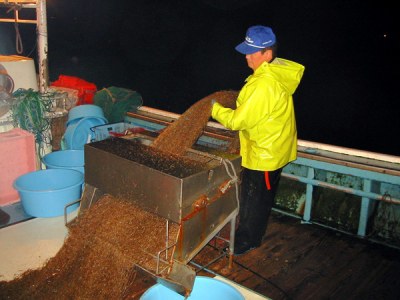 育成稚貝の収容2:取り出した稚貝を選別機で選別します。