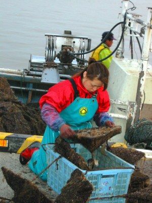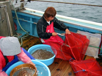 育成稚貝の収容1:ザブトン籠で中間育成していた稚貝を籠から取り出します。