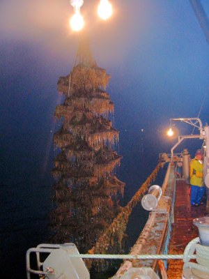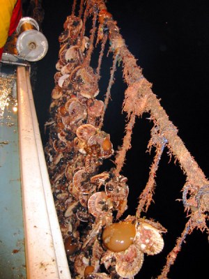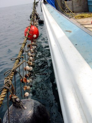 中間育成終了:分散後、ザブトン籠で翌年春まで育成された稚貝は、耳吊りするため引きあげます。