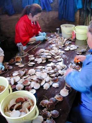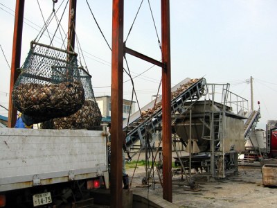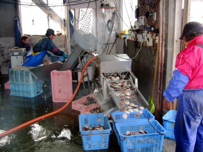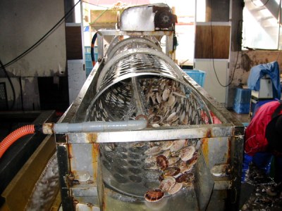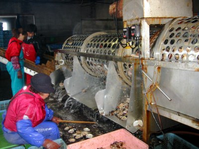 選別及び洗浄2:選別機で処理された貝は見事にきれいになります。
