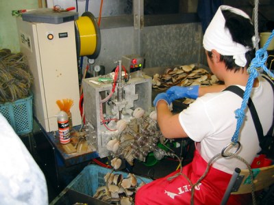 穴あけ:自動耳吊り機を使い、稚貝の穴あけ、テグス通し、ロープへの固定を瞬時に行います。