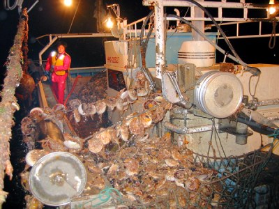 水揚げ:巻き取り機などを使いながら、ロープからホタテガイを外し、水揚げします。
