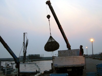 陸揚げ:船上で大きな綱袋に収容したホタテガイをトラックに積み込み作業場に運ばれます。