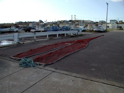 網漁具の全景:漁具は大きく分けて袖網、身網、胴尻の3部分で構成され、袖網には浮子と沈子、身網の入口には口開け棒が、胴尻の最後尾には開閉用のファスナーが付けられている。