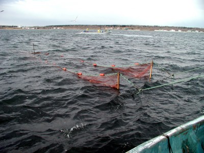 | 漁具 | 打瀬網漁業は、漁場内では動力を使用せず帆を張り風力により操業を行う。 網は大きく分けて袖網、身網、胴尻の3部分から構成されており、袖網には浮子と沈子、身網の入口には口開け棒が、胴尻の最後尾には開閉用のファスナーが付けられている。 全長16メートル以内、網は10節(3.4センチメートル)以上の大きい目合いを使用するよう制限している。 |