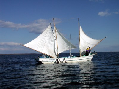 曳網:帆を張り風力でホッカイエビの生息場であるアマモ場で網を曳きます。