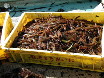 漁獲物2:選別の終わったエビはカゴに入れられ操業終了まで鮮度を保つため海中に垂下します。