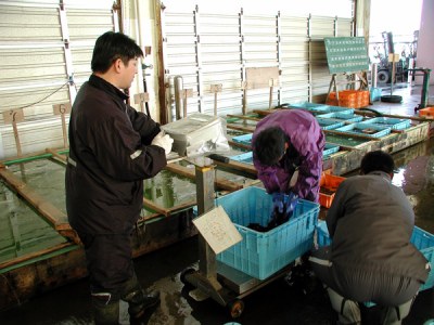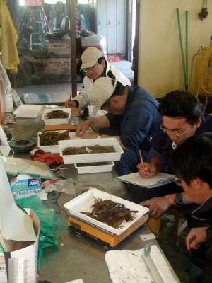 資源調査2:陸上で漁協、町、指導所職員が雌雄の判別、体長、体重の測定を行っているところです。