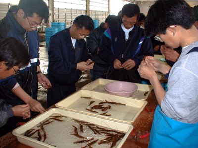 標識放流調査:漁協、町、指導所職員によりエビに標識を装着しているところ(標識としてエビの額角にカラー針金を巻く)です。