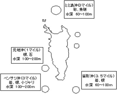 | 漁場 | 水深60~100メートルの砂、岩礁帯 |