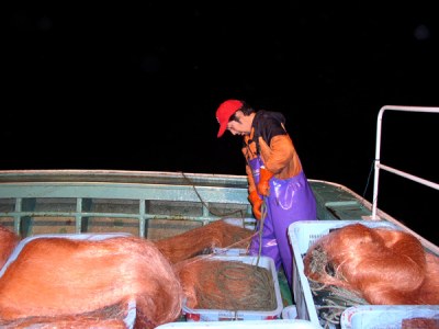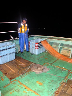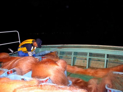 出港、準備:午前2時。前日に用意した入れ替えの刺し網を確認しながら漁場を目指して出港です。