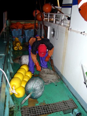 投網準備1:漁場が近づくと手早く投網の準備を始めます。