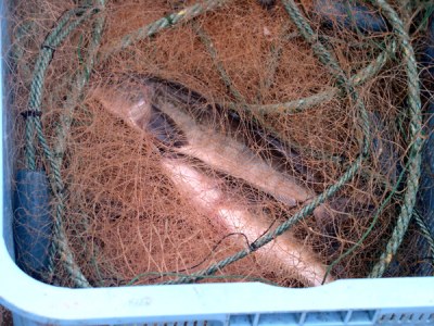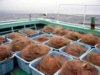 | 漁具 | 刺し網 目合い:2寸3分5厘(71ミリメートル) 53掛 ナイロン 縮結:5割 100間(約182メートル)の網地を50間に切って使用 一放し(建て):4,000~5,000間  |