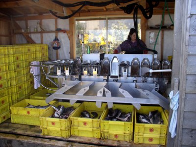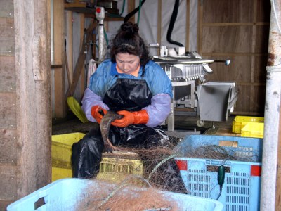 網はずし1:網から一尾一尾、手作業で魚をはずしていきます。
