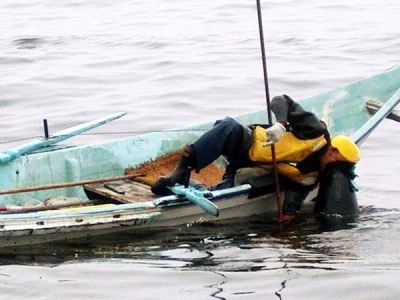 操業2:メガネでのぞき込みながら「たも」を使って漁獲します。