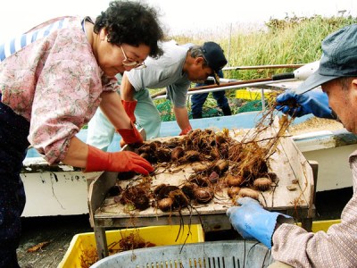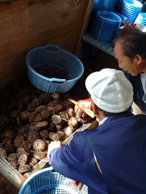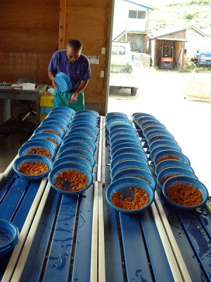 検品1:検量・検品のために集荷場で並べられた「むき身」。