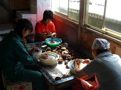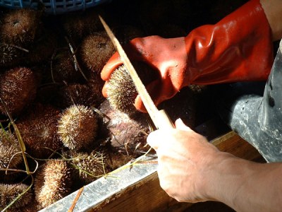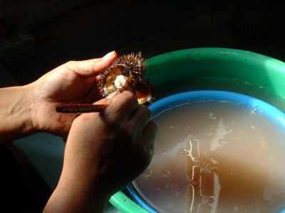 剥き作業1:ウニむき作業をしているところ。身(生殖巣)を崩さないように慎重にとりだします。