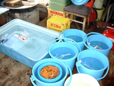 滅菌海水:洗浄用に用意している冷えた滅菌海水です。
