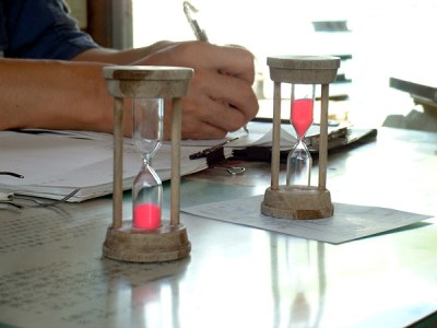 水切り:3分間かけて水切りします。時間計測に砂時計を使います。